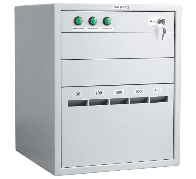 Нижний ящик снабжен 5-ти секционной кассетой для хранения депонируемых банкнот раздельно по номиналам. Вместимость одной секции до 1500 купюр (в пачках)