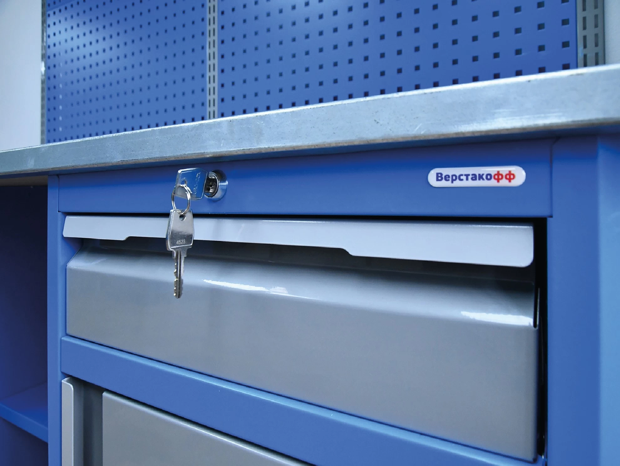 - Верстак состоит из прочной двухслойной столешницы, поддерживаемой двумя тумбами из профилированной холоднокатаной стали, и полки-стенки.